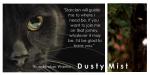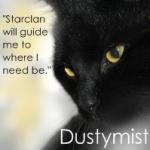 Name: Dustymist Thunderclan Warrior Style: Avi or siggy - which ever one you would like to make. Physical discription: Black with white patches, long tail and medium long hair. My eyes are large and golden yellow Other: Believes in Starclan and always tries to follow the warrior code. Personality: I am friendly, somewhat shy at first, but I love to talk once I get started.